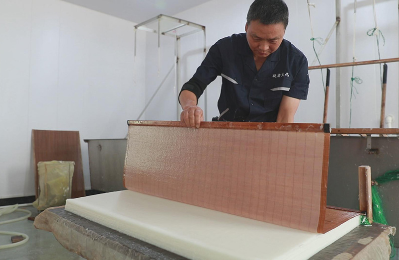徽州楮皮紙起源于北宋,是利用當(dāng)?shù)靥赜械蔫ぶ谱鞒鲞m合書畫使用的一種紙品。2003年,非遺傳承人朱建新創(chuàng)辦公司,致力于徽州楮皮紙的傳承和發(fā)展。2018年徽州楮皮紙被錄入中國手工紙文庫,2019年徽州楮皮紙制作技藝成為了黃山市非遺傳承項目。 徽州楮皮紙的制作主要分為6個步驟,揀料:去除黃莖