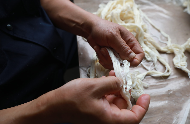 徽州傳統(tǒng)手工楮皮紙,采用傳統(tǒng)手工抄紙工藝,經(jīng)過27道工序,以手工精細(xì)制作而成,產(chǎn)品主要有楮皮紙、云龍紙、皺紋紙、落水紙、棉紙、版畫、攝影畫、手撕畫專用紙。 生產(chǎn)工序: 浸泡—→腳踏—→清水蒸煮—→切料—→石灰漿浸泡—→蒸煮—→自然漂洗—→腳踏