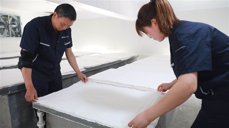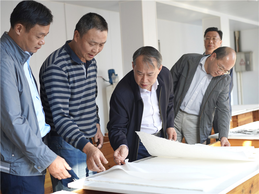 10月9日下午,縣長吳云忠赴海陽鎮(zhèn)凝霜文化發(fā)展公司調(diào)研徽州楮皮紙傳承與發(fā)展工作,縣委常委、海陽鎮(zhèn)黨委書記金學(xué)年,縣委常委、縣政府副縣長程衛(wèi)華參加調(diào)研活動。 吳云忠一行實地察看了徽州楮皮紙生產(chǎn)工藝流程,認(rèn)真聽取企業(yè)負(fù)責(zé)人介紹,詳細(xì)詢問徽州楮皮紙制作工藝